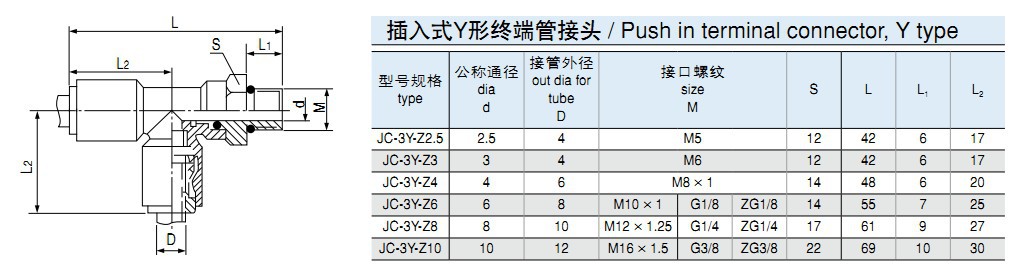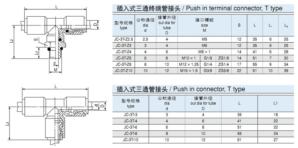 ①:插入式三通終端管接頭 公稱通徑 Ø6MM JC-3T-Z6 M10×1