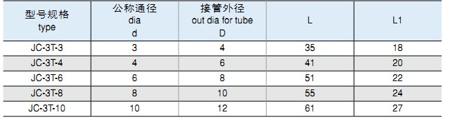 安裝及應用一、JC系列插入式管接頭,適用于連接硬質、半硬質尼龍管、塑料管,最大工作壓力為1.0MPa。該系列管接頭安裝方便,密封可靠,接管牢固、美觀。二、1、氣管切斷后去除毛刺, 將氣管一端插入接頭插口內(nèi)(一定要插到底)即可達到牢
