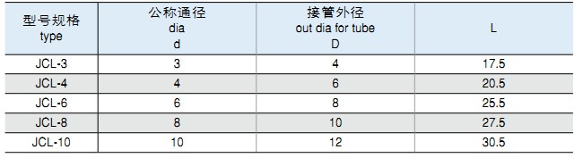 一、JC系列插入式管接頭,適用于連接硬質(zhì)、半硬質(zhì)尼龍管、塑料管,最大工作壓力為1.0MPa。該系列管接頭安裝方便,密封可
