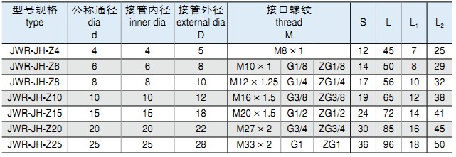 ![]() 安裝及應(yīng)用 一、JWR系列外插式管接頭,適用于連接軟質(zhì)尼龍管,塑料管及膠管。最大工作壓力為1.0MPa。該系列接頭具有結(jié)構(gòu)簡單,使用方便,安裝牢固等優(yōu)點。 外形尺寸 |