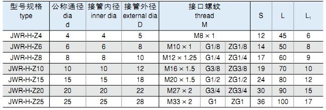 ![]() 安裝及應(yīng)用 一、JWR系列外插式管接頭,適用于連接軟質(zhì)尼龍管,塑料管及膠管。最大工作壓力為1.0MPa。該系列接頭具有結(jié)構(gòu)簡單,使用方便,安裝牢固等優(yōu)點。 外形尺寸 |