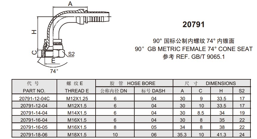 20791 90° 國標公制內(nèi)螺紋74°內(nèi)錐面 扣壓式軟管接頭