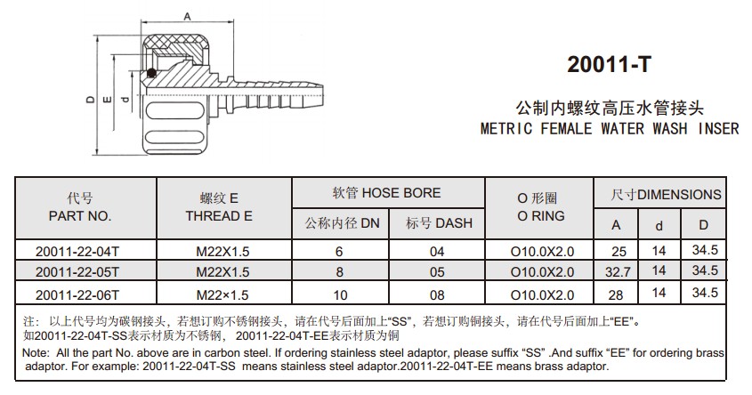 20011-T 公制內(nèi)螺紋高壓水管接頭