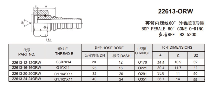 22613-ORW 英管內螺紋60°外錐面O形圈