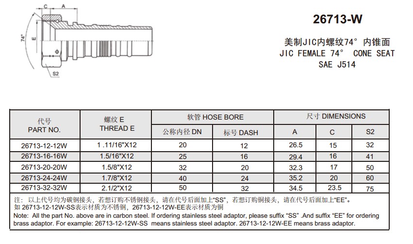 26713-W 美制JIC內(nèi)螺紋74°內(nèi)錐面