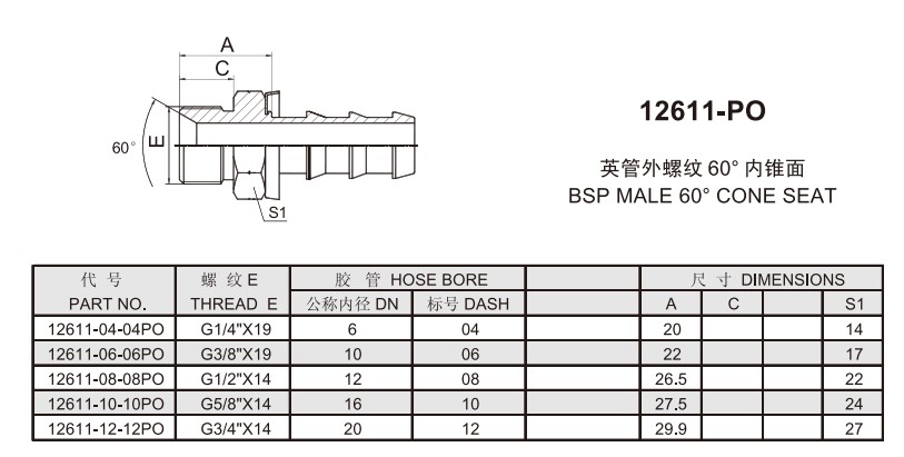 12611-PO 英管外螺紋60°內(nèi)錐面