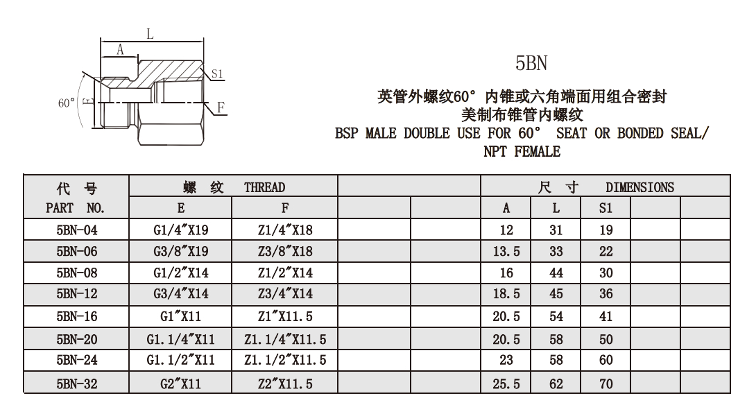 5BN 英管外螺紋60°內(nèi)錐或六角端面用組合密封 美制布錐管內(nèi)螺紋