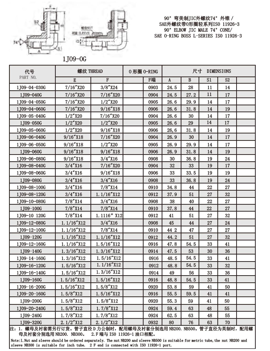 1JO9-OG 90°彎美制JIC外螺紋74°外錐/ SAE外螺紋帶O形圈輕系列IS0 11926-3
