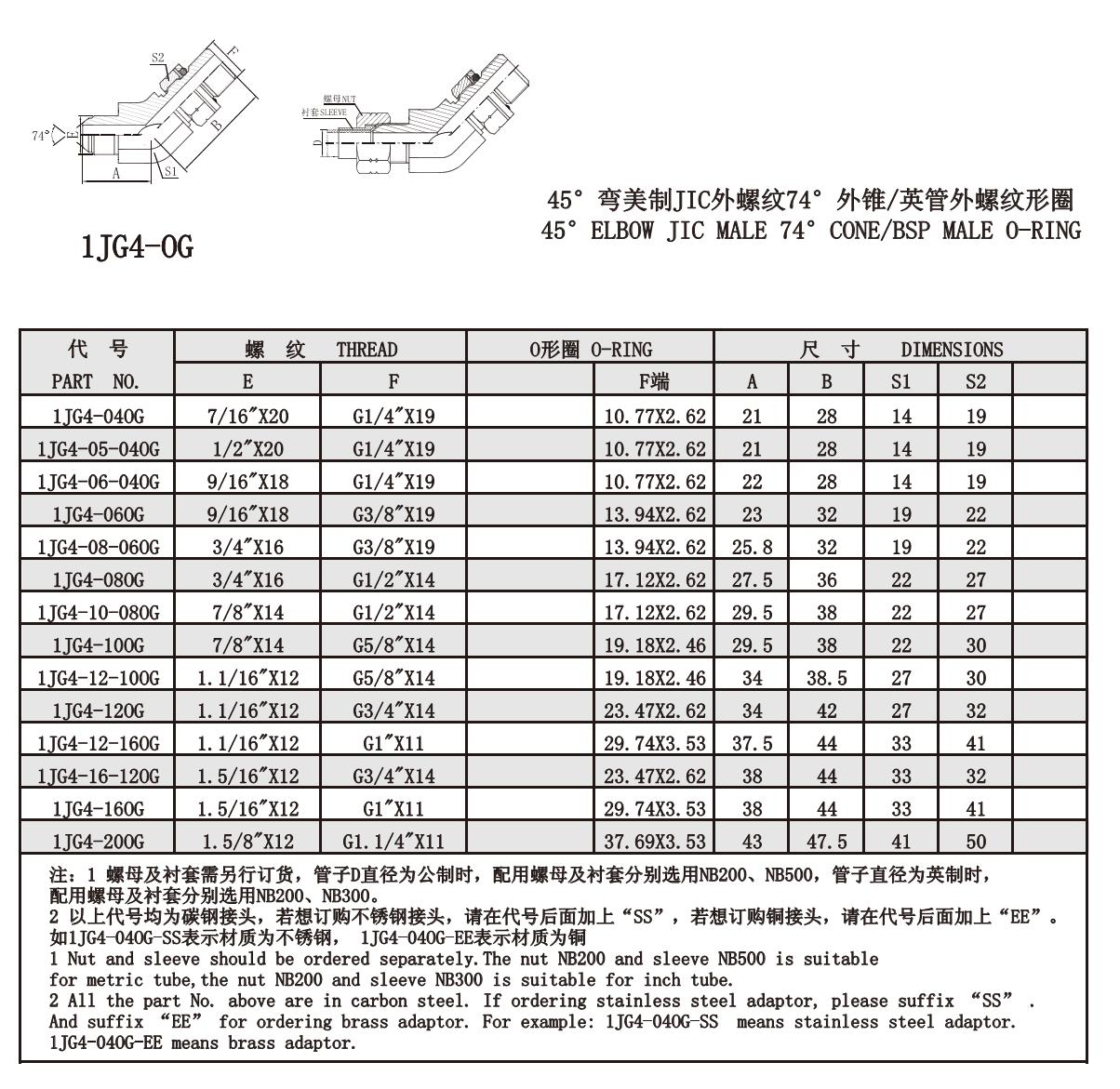 1JG4-OG 45°彎美制JIC外螺紋74°外錐/英管外螺紋形圈