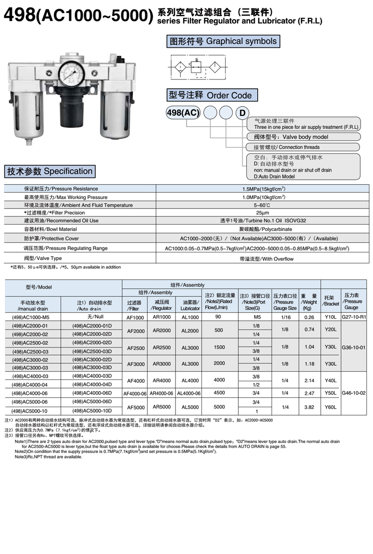 498 系列氣源處理三聯(lián)件產(chǎn)品特點(diǎn):該三聯(lián)件是由空氣過(guò)濾器、空氣減壓閥、油霧器三部份組合而??諝膺^(guò)濾器采用旋風(fēng)葉片分離水分及雜質(zhì),通過(guò)微孔截留塵埃,存水杯采用透明的聚碳酸脂制成,能清晰地觀察積存的水量??諝鉁p壓閥,是溢流式膜片型空氣減壓閥,它直接靠手