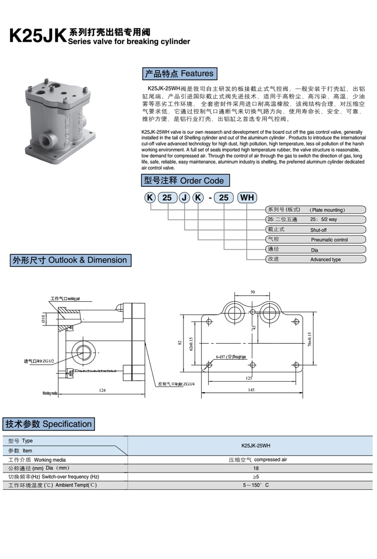 K25JK 系列打殼出鋁專用閥產(chǎn)品特點(diǎn): K25JK-25WH閥是我司自主研發(fā)的板接截止式氣控閥,一般安裝于打殼缸、出鋁缸尾端。產(chǎn)品引進(jìn)國(guó)際截止式閥先進(jìn)技術(shù),適用于高粉塵、高污染、高溫、少油霧等惡劣工作環(huán)境, 全套密封件采用進(jìn)口耐高溫橡膠,該閥結(jié)