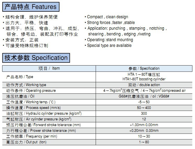 技術(shù)參數(shù) Specification項(xiàng)目 / Item 參數(shù) / Specification產(chǎn)品名稱(chēng) / TypeHTA 1~80T增壓缸HTA1-80T boosting cylinder動(dòng)作方式