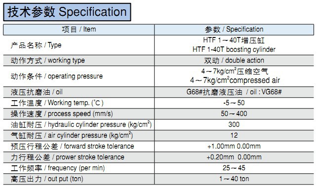 技術(shù)參數(shù) Specification項(xiàng)目 / Item 參數(shù) / Specification產(chǎn)品名稱 / TypeHTF 1~40T增壓缸HTF 1-40T boosting cylinder