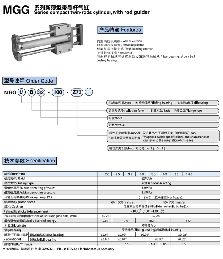 帶導(dǎo)桿氣缸 MGG 系列,體積小、輕巧,側(cè)面負載抵抗力強,扭力抵抗力強,不搖轉(zhuǎn)精度高,導(dǎo)向桿的軸承可選擇滑動軸承或滾珠導(dǎo)向軸承,方便安裝使用,二面接管位置可供選擇。