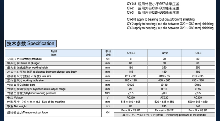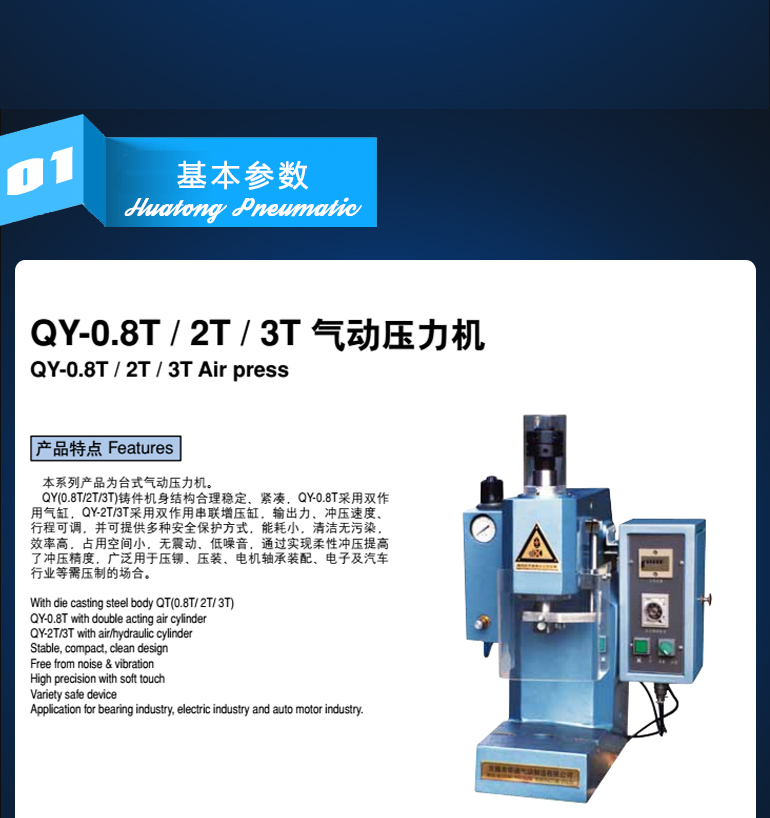 QY(0.8T/2T/3T)鑄件機身結(jié)構(gòu)合理穩(wěn)定、緊湊,QY-0.8T采用雙作用氣缸,QY-2T/3T采用雙作用串聯(lián)增壓缸,輸出力、沖壓速度、行程可調(diào),并可提供多種安全保護方式,能耗小,清潔無污染,效率高,占用空間小,無震動、低噪音,通過實現(xiàn)柔性沖壓提高了沖壓精度,廣泛用于壓鉚、壓裝、電機軸承裝配、電子及汽車行業(yè)等需壓制的場合。