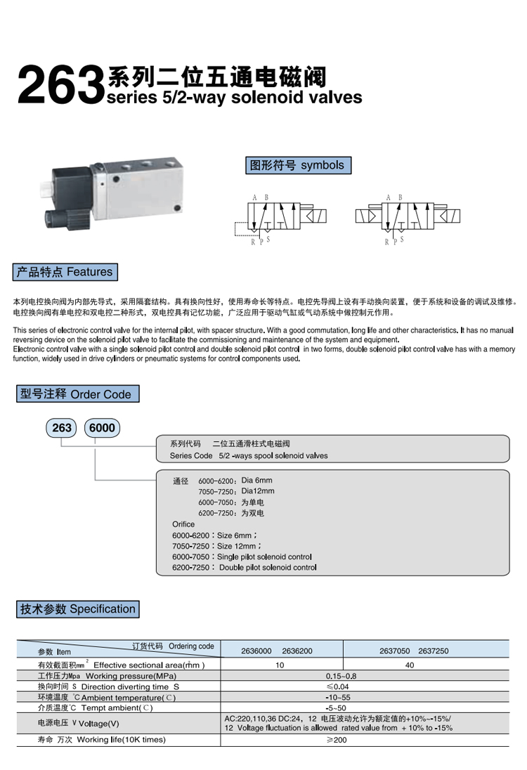 263系列 二位五通換向電磁閥 產(chǎn)品特點(diǎn) 2636000.2637050電磁換向閥廣泛適用于工作條件好;安裝空間小等場(chǎng)合的氣動(dòng)自動(dòng)化控制系統(tǒng)。它接到電信號(hào)能迅速切換氣流的方向達(dá)到自動(dòng)控制的目的。 2636000.2637050