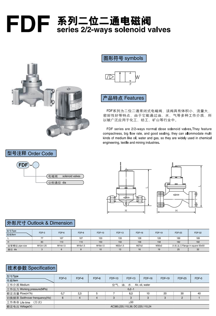 FDF系列 二位二通電磁閥為二位二通常閉式電磁閥,該閥具有體積小、流量大,密封性好等特點(diǎn),由于它能通過(guò)油、水、氣等多種工作介質(zhì),所以被廣泛應(yīng)用于化工、紡工、礦山等行業(yè)中。型號(hào)FDF-3 FDF-6 FDF-8 FDF-10 FDF-13 FDF-16 FDF-19