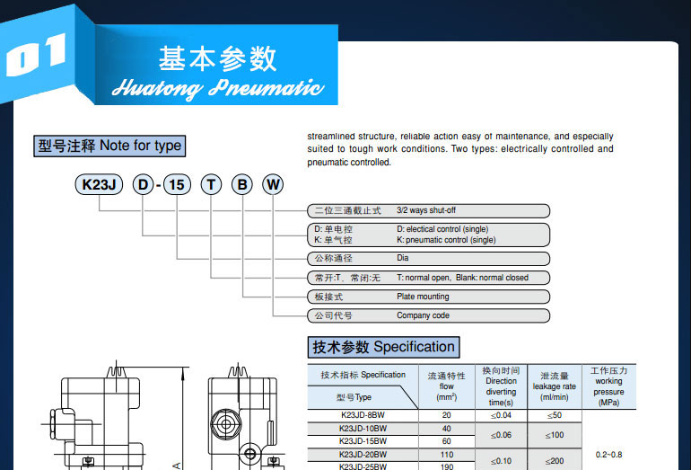 K23J-BW系列 二位三通板接截止式換向電磁閥 產(chǎn)品特點: K23JD-BW系列是二位三通板接截止式換向閥。該閥結(jié)構(gòu)合理,動作可靠,維修方便,尤其適用于較為惡劣的工作環(huán)境。分電控和氣控兩種。