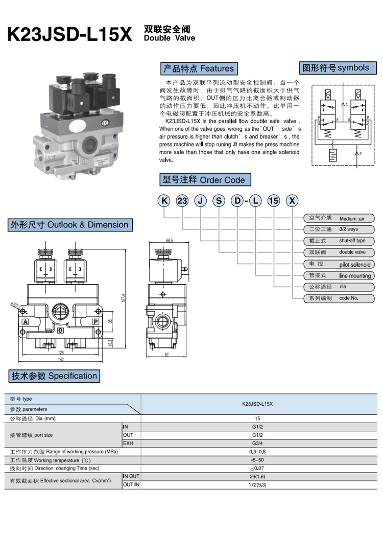 K23JSD-L15L-G/R系列雙聯(lián)安全閥為雙聯(lián)交叉流動(dòng)型安全控制閥,通過兩組并聯(lián)結(jié)構(gòu)的閥芯,保證在相等的先導(dǎo)控制壓力作用下,兩組閥芯同步動(dòng)作。當(dāng)控制失靈或自身發(fā)生故障,造成一組閥芯開啟,另一組閥芯處在關(guān)閉的狀態(tài)