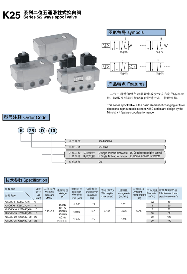 K25系列 二位五通換向閥產(chǎn)品特點(diǎn) 二位五通滑閥供氣動(dòng)裝置中改變氣流方向的基本元件。K25D系列是機(jī)械部聯(lián)合設(shè)計(jì)產(chǎn)品,性能優(yōu)越。圖形符號(hào):型號(hào)注釋:技術(shù)參數(shù):型號(hào)參數(shù)公稱通徑mm工作壓力MPa電源電壓V換向時(shí)間(sec)切換頻率(Hz)壽命萬次