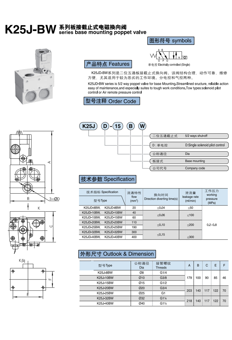 K25JD-BW系列是二位五通板接截止式換向閥。該閥結(jié)構(gòu)合理,動(dòng)作可靠,維修方便,尤其適用于較為惡劣的工作環(huán)境。分電控和氣控兩種。