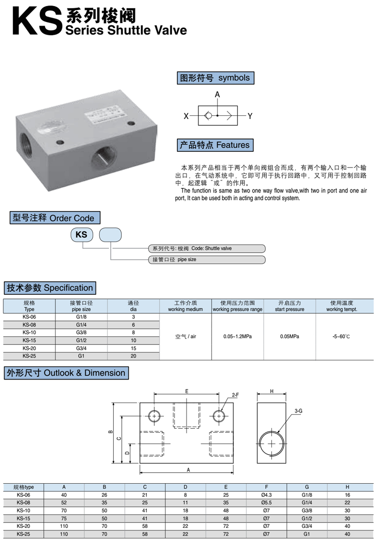 梭閥 KS系列產(chǎn)品相當(dāng)于兩個(gè)單向閥組合而成,有兩個(gè)輸入口和一個(gè)輸出口,在氣動系統(tǒng)中,它即可用于執(zhí)行回路中,又可用于控制回路中,起邏輯“或”的作用。