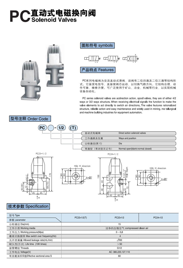 PC系列電磁閥為交流直動式滑閥,該閥有二位四通及二位三通等結(jié)構(gòu)形式。它接受電信號,直接使閥芯運動,以切換氣路方向。它結(jié)構(gòu)合理,動作可靠,維修方便??蓮V泛使用于礦山、冶金、機械等行業(yè),以實現(xiàn)機械設(shè)備自動化。