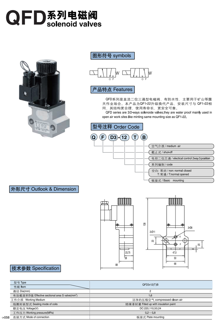 QFD3-12B系列 直流二位三通型電磁閥 QFD3系列是直流二位三通型電磁閥,有防水性,主要用于礦山等露天作業(yè)場合.