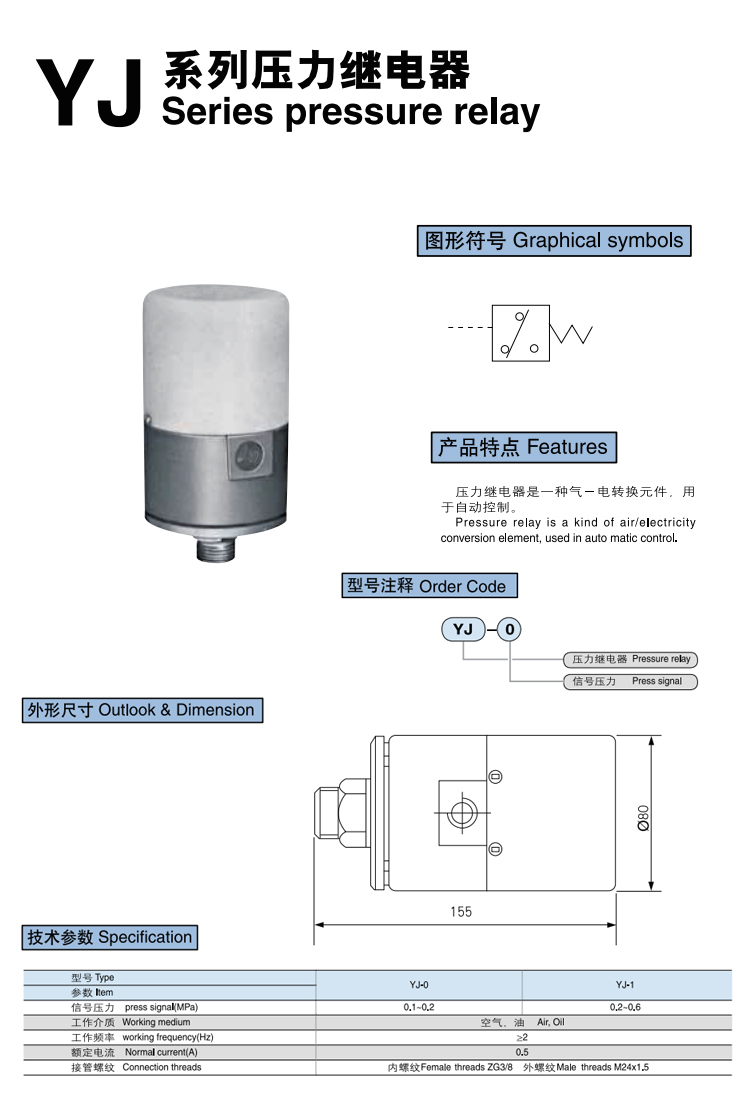 華通氣動(dòng) YJ系列壓力繼電器,壓力繼電器是一種氣-電轉(zhuǎn)換元件,用于自動(dòng)控制。